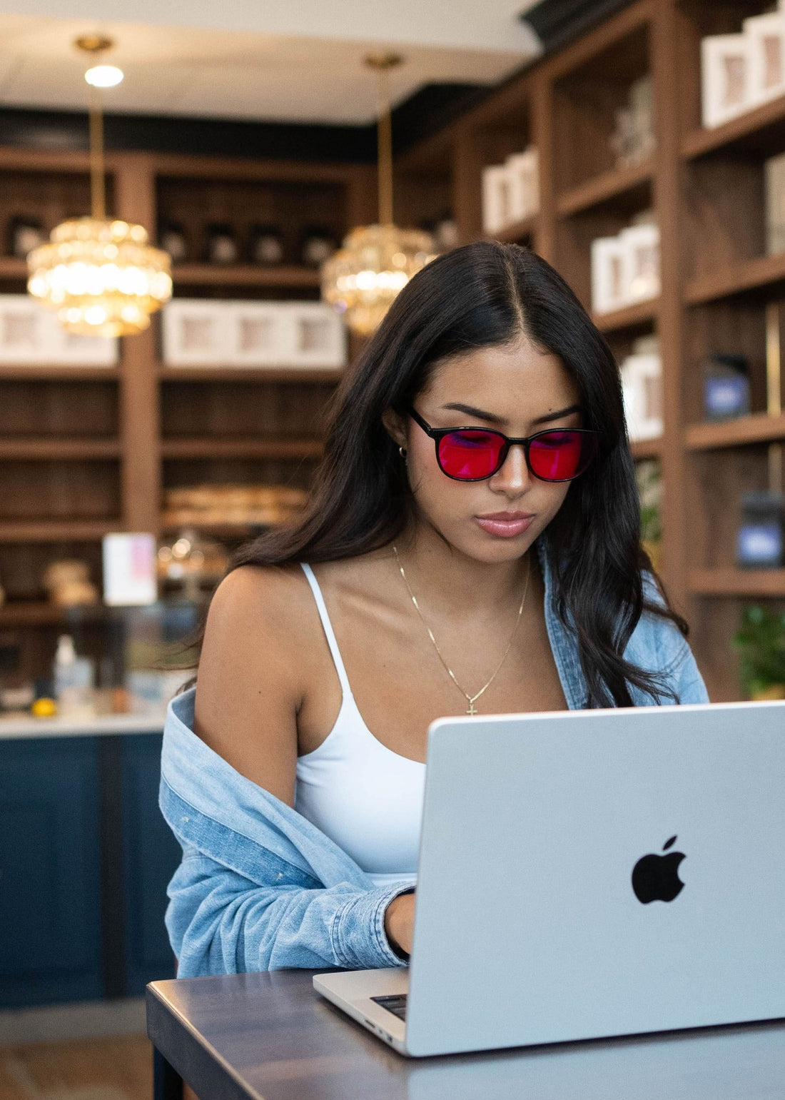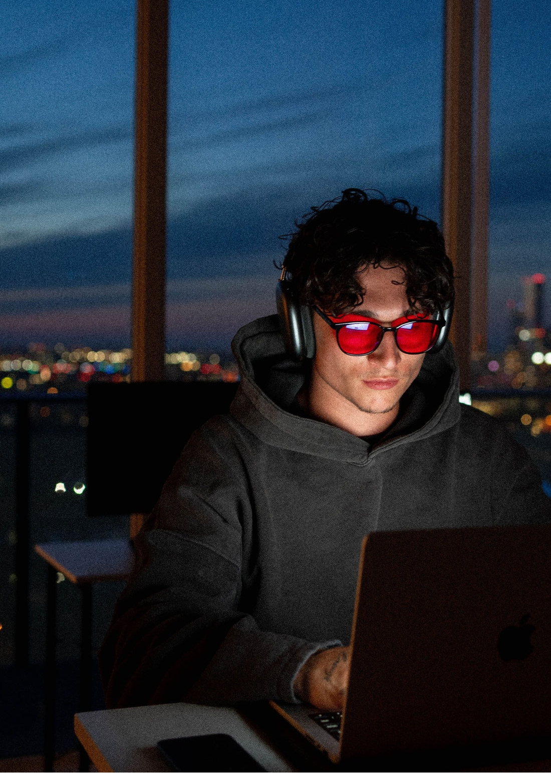 Las lentes rojas están diseñadas principalmente para la noche, ya que bloquean casi el 100% de la luz azul y verde (400–520 nm). Esto ayuda a reducir la estimulación visual y favorece un descanso más profundo y reparador.